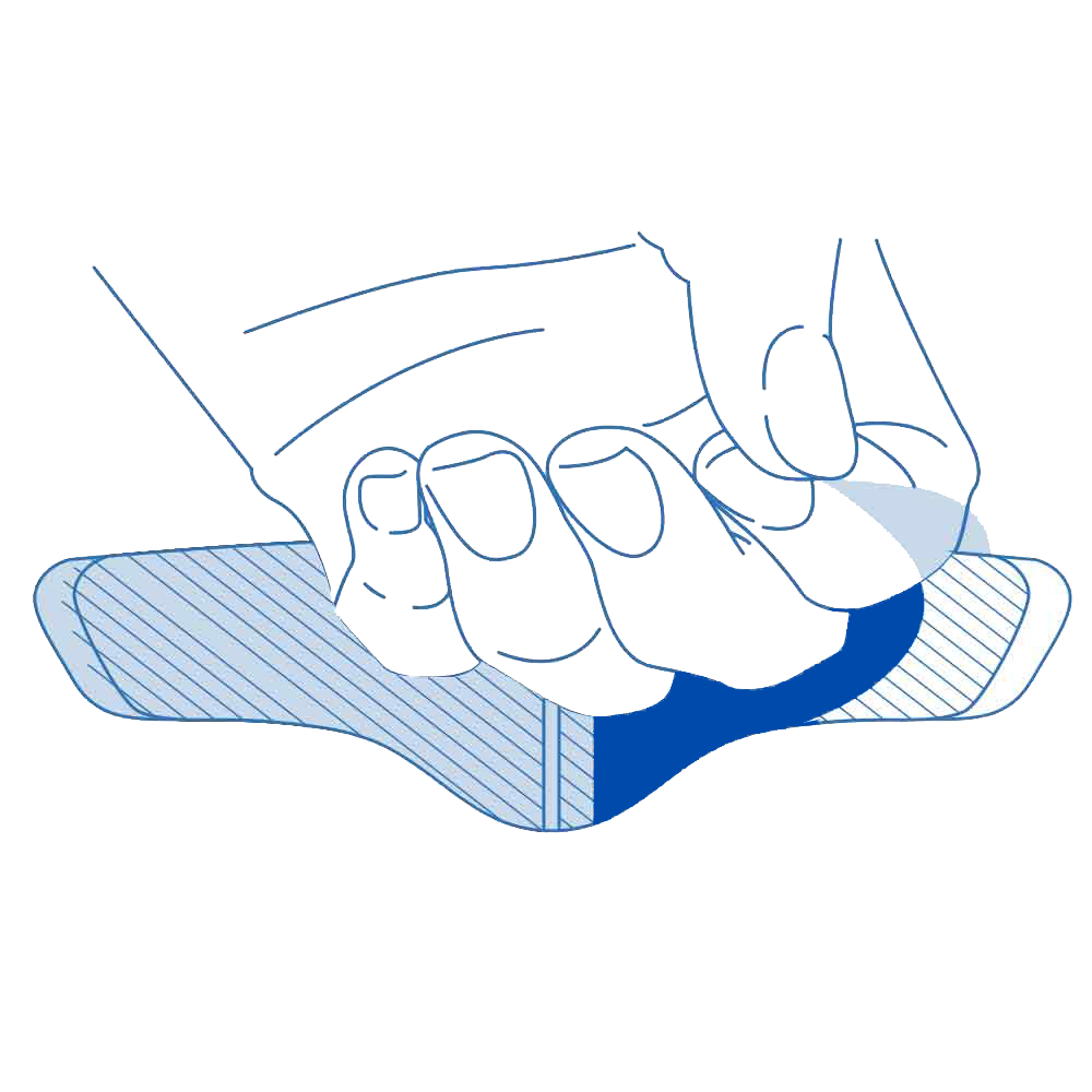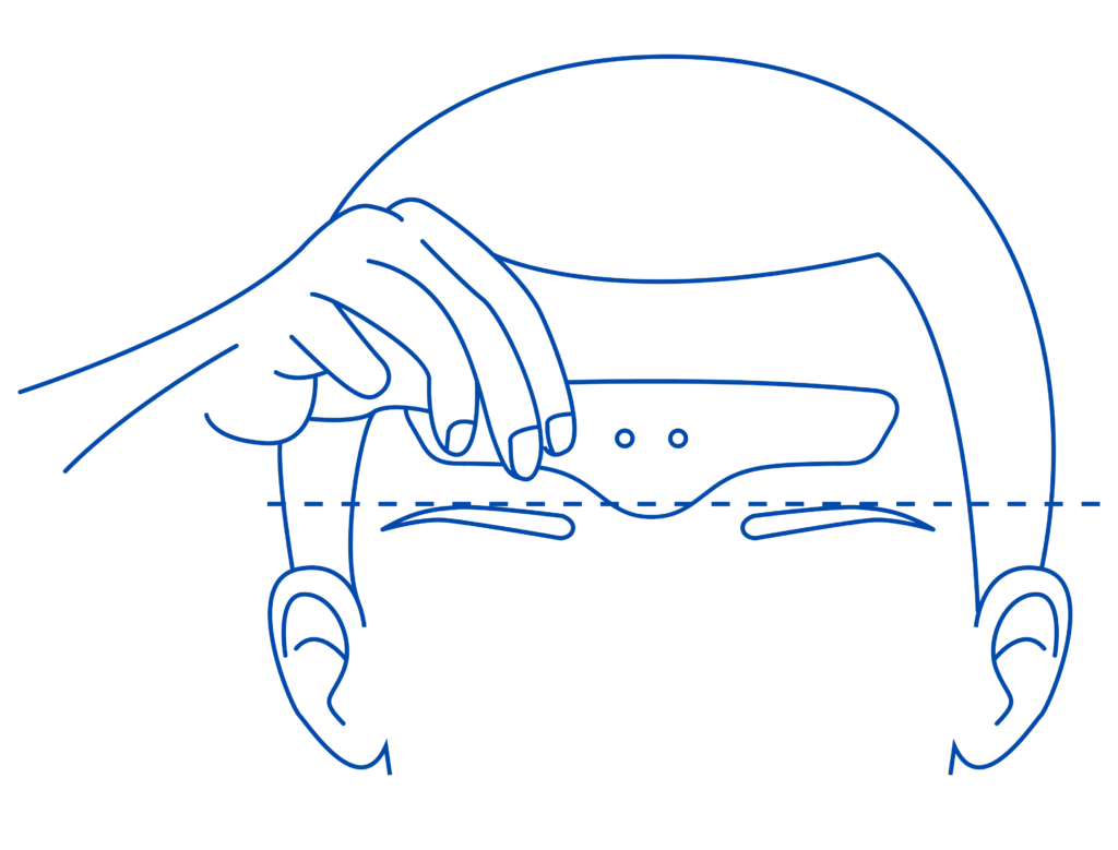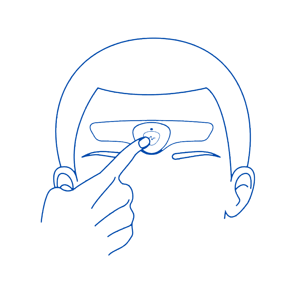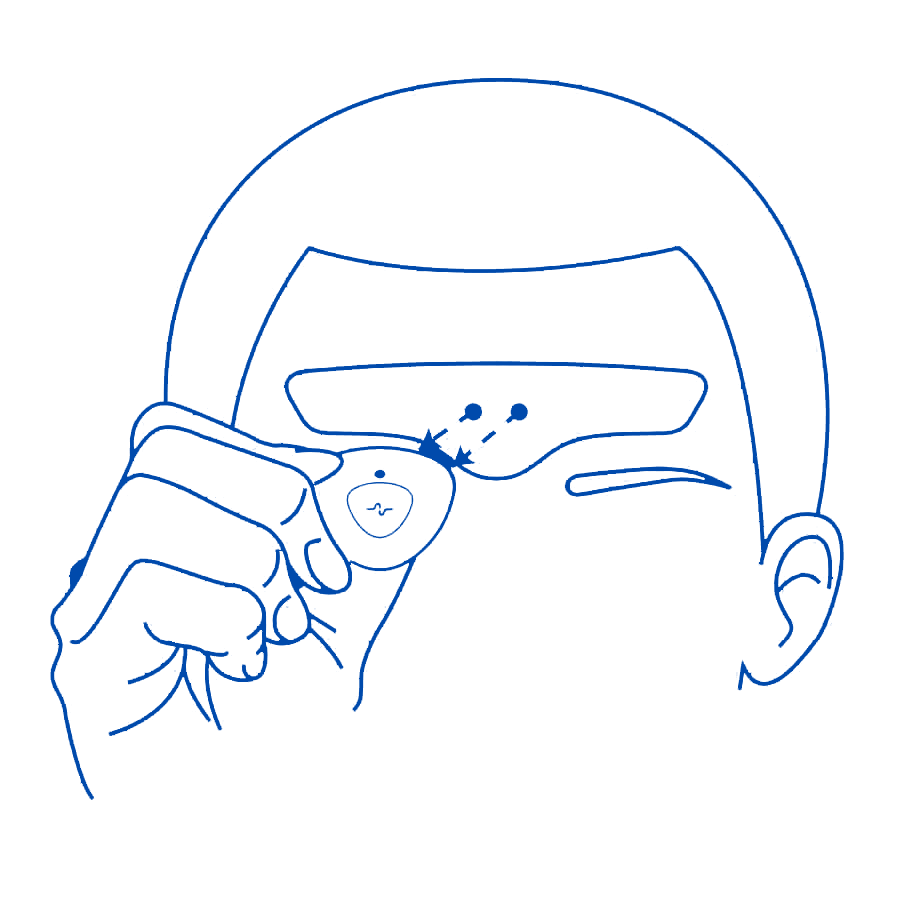 With the gel side down, using a mirror for guidance, paste the electrode one finger width above the eyebrows.