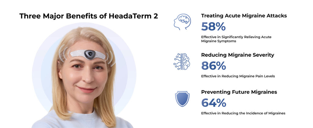 HeadaTerm 2 is a clinically proven, safe, and effective medical device worn on users’ foreheads that uses none-invasive neuronal electrical stimulation technology to prevent and treat primary headache, including migraine, tension headache, cluster headache.